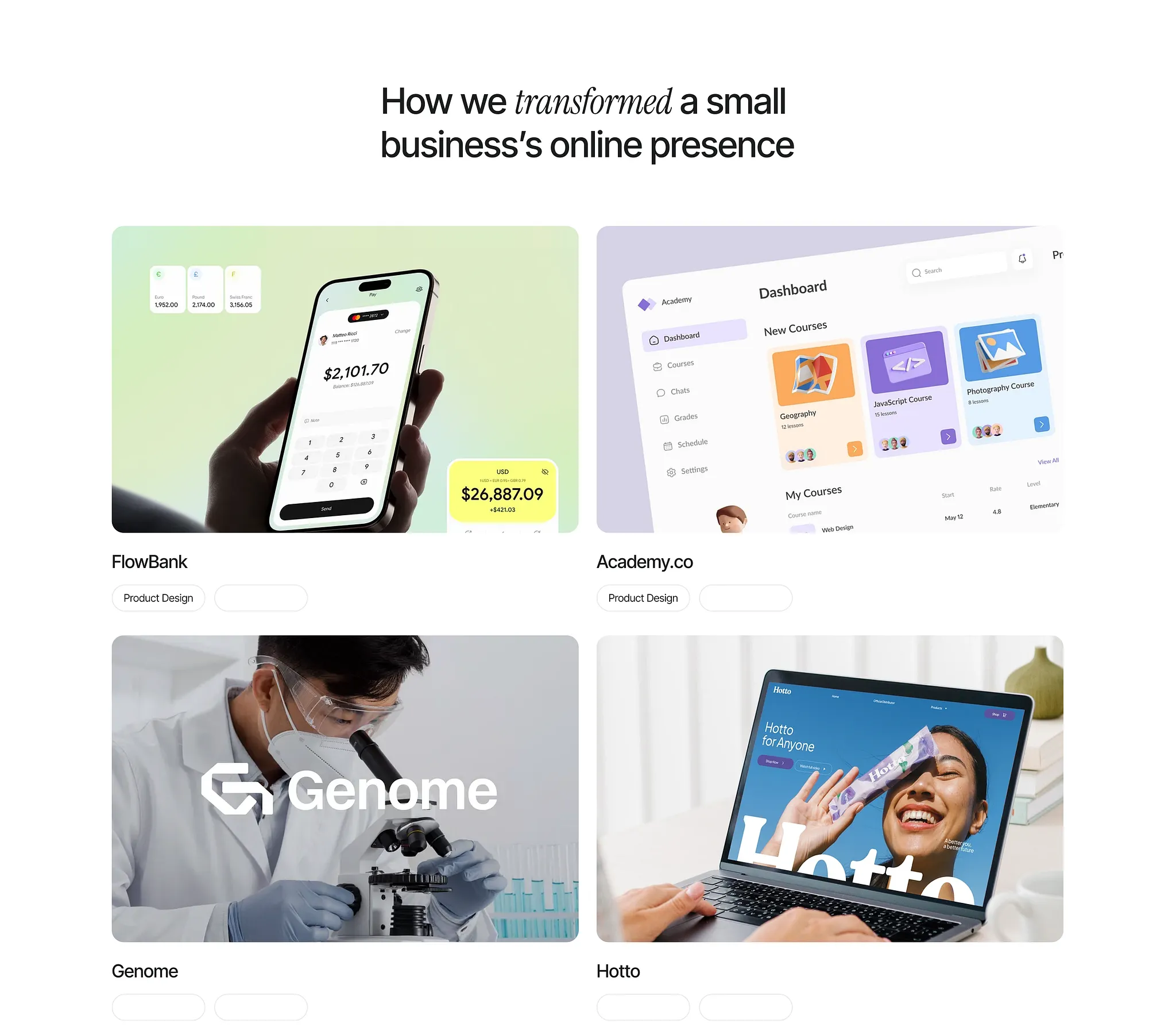 Our completed projects showcase expertise across startup design, SaaS design, e-commerce design, landing page design, and enterprise digital transformation initiatives.