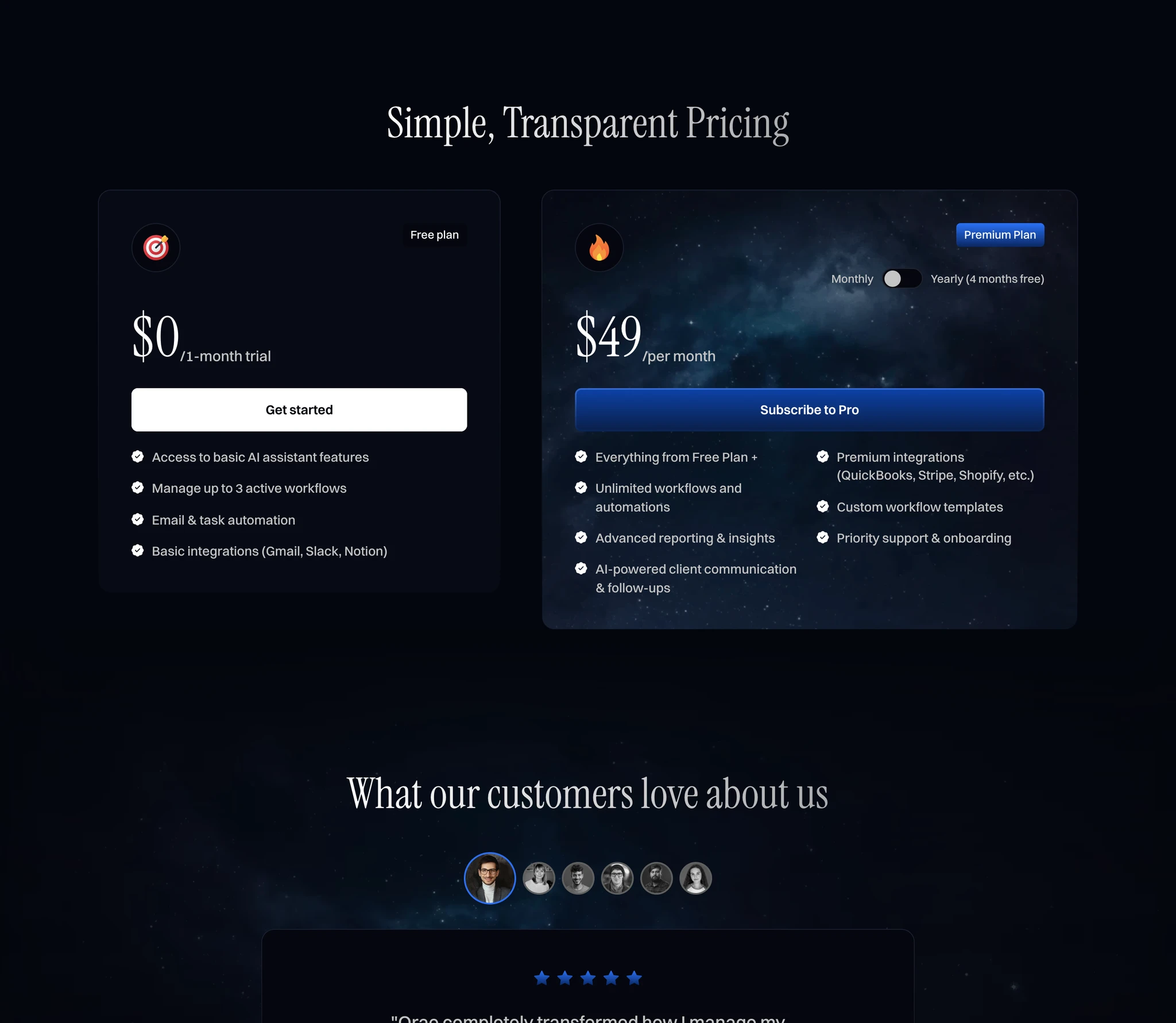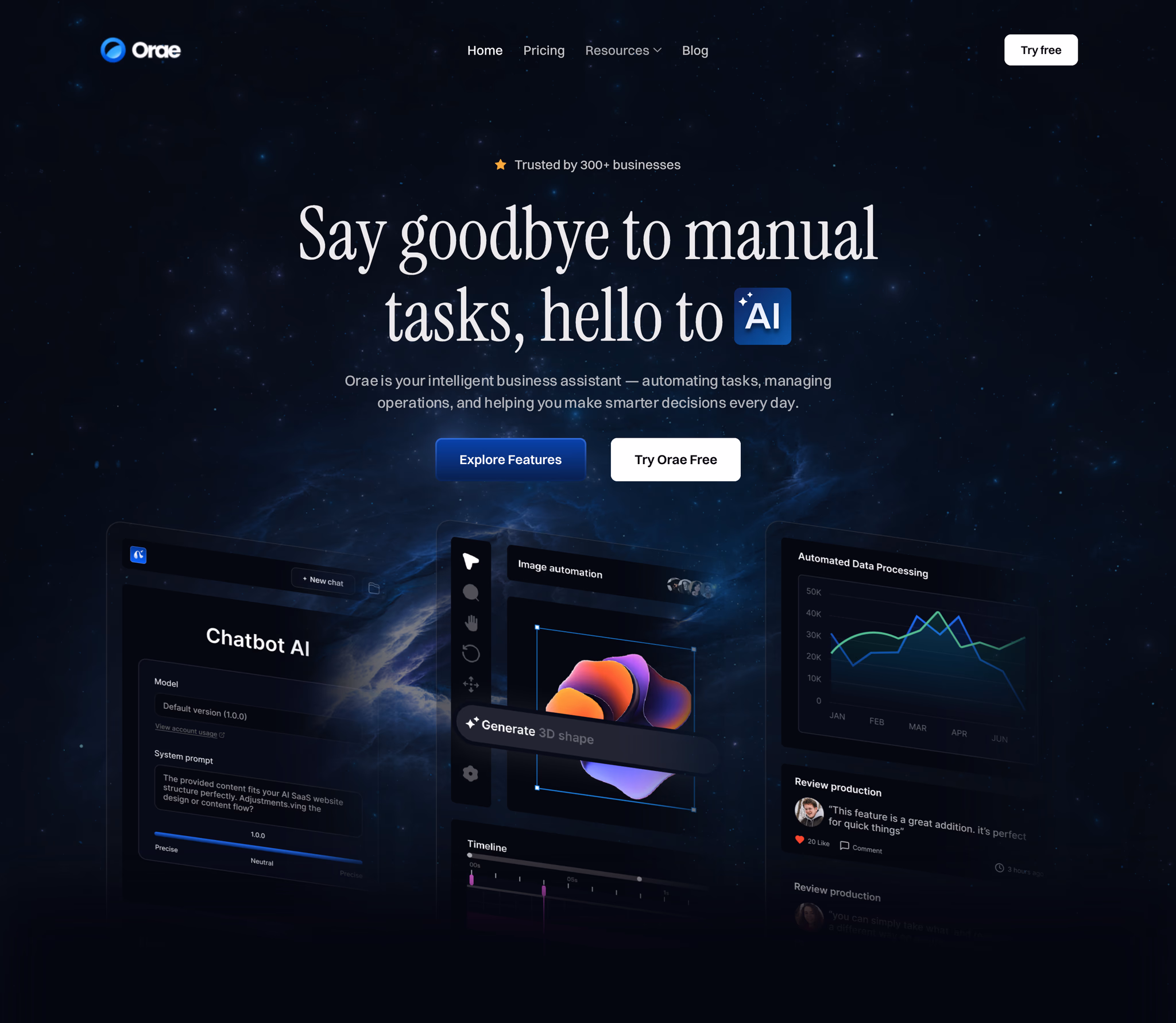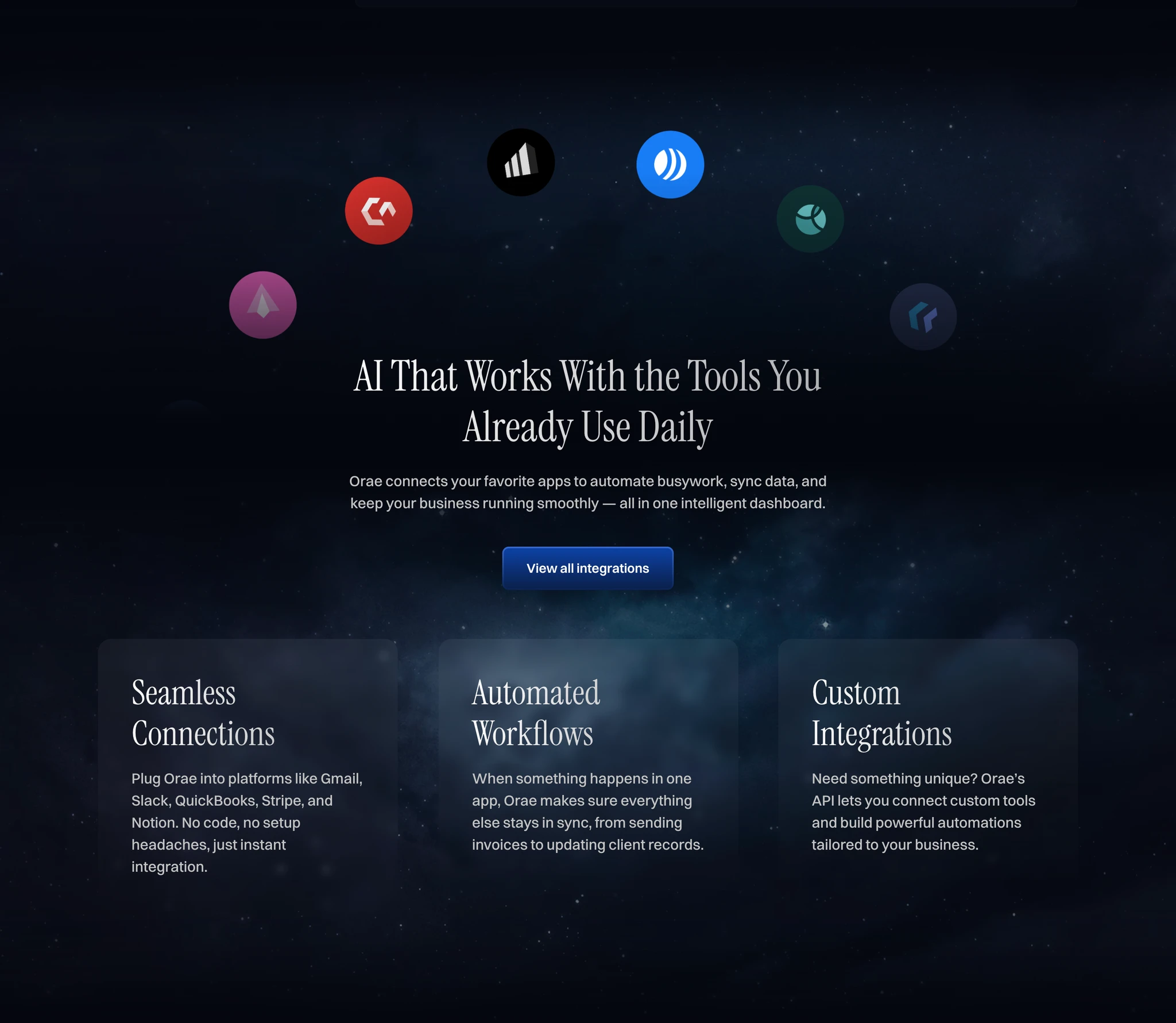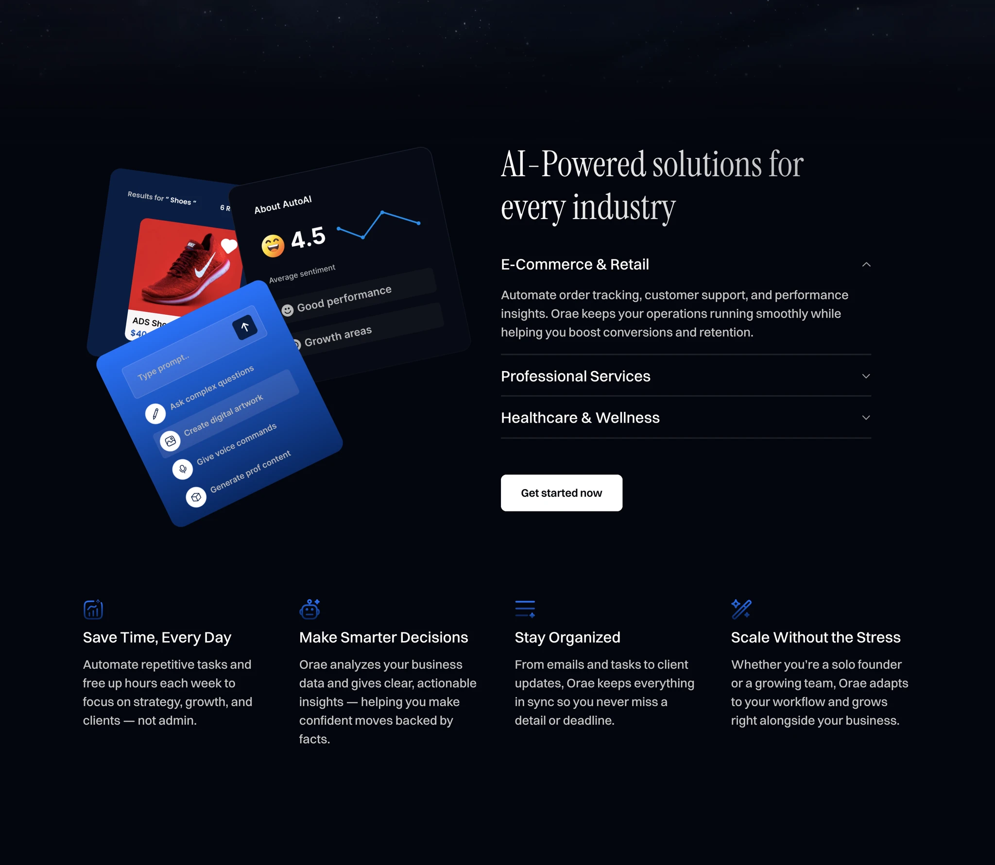Website design for Orae, an AI-powered business assistant that automates operations and streamlines decision-making.